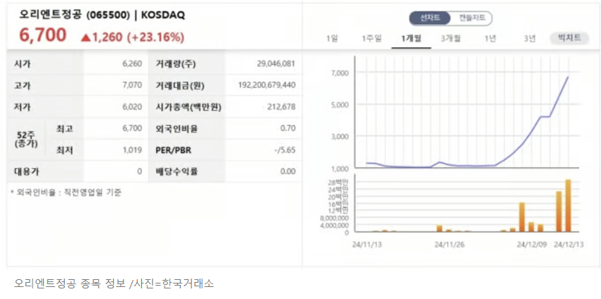 오리엔트정공은 탄핵 국면으로 접어든 4일부터 7거래일 동안 6번의 상한가를 기록했습니다. 지난 3일 1131원이던 주가는 13일 6700원으로 6배 가까이 뛰었습니다. 이는 투자자들이 이재명 대표에 대한 기대감으로 관련 종목에 베팅한 결과로 볼 수 있습니다. 오리엔트정공의 무서운 상승세는 앞으로도 계속될지 주목됩니다.